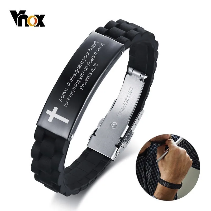 Addition Information of Vnox Religious Cross Jesus Scripture Quote Christian Bible Verse Inspiring Faith Silicone Bracelets for Men Personalize Gift
