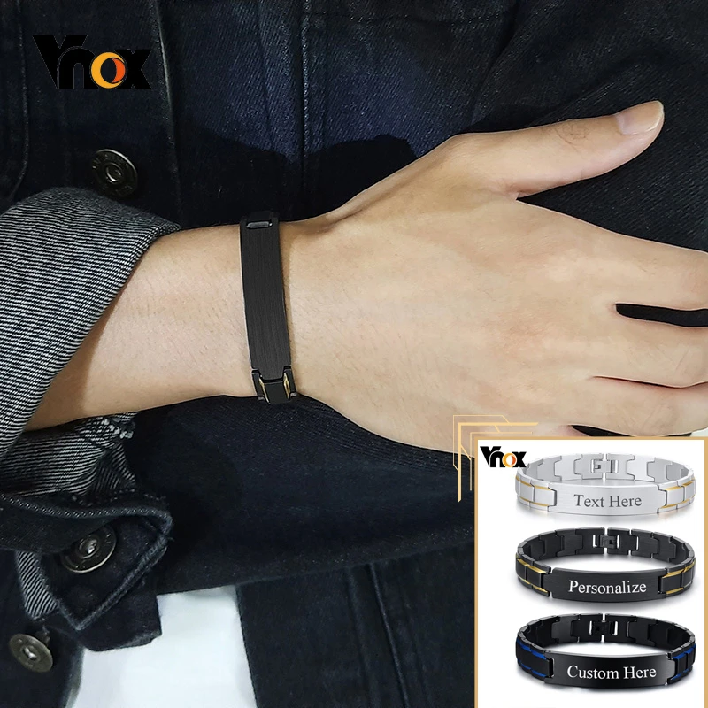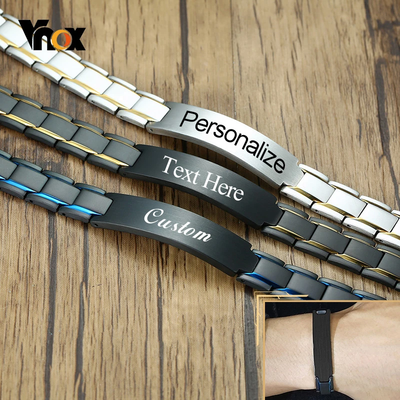 Vnox Stylish 12mm Width Men's Bracelet Free Personalized Custom ID Tag Stainless Steel Watchband Chain Jewelry To Husband Father Features