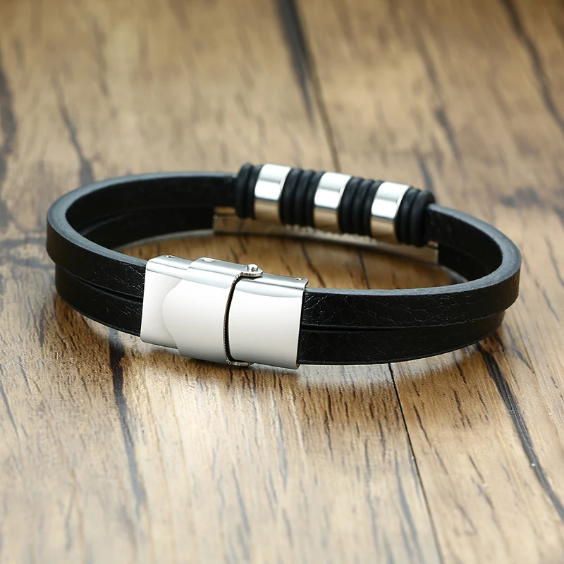 Addition Information of Vnox Casual Men's Leather Bracelets with Customize Engrave Service Double Layers Stainless Steel ID Bar Male Jewelry 20.5cm